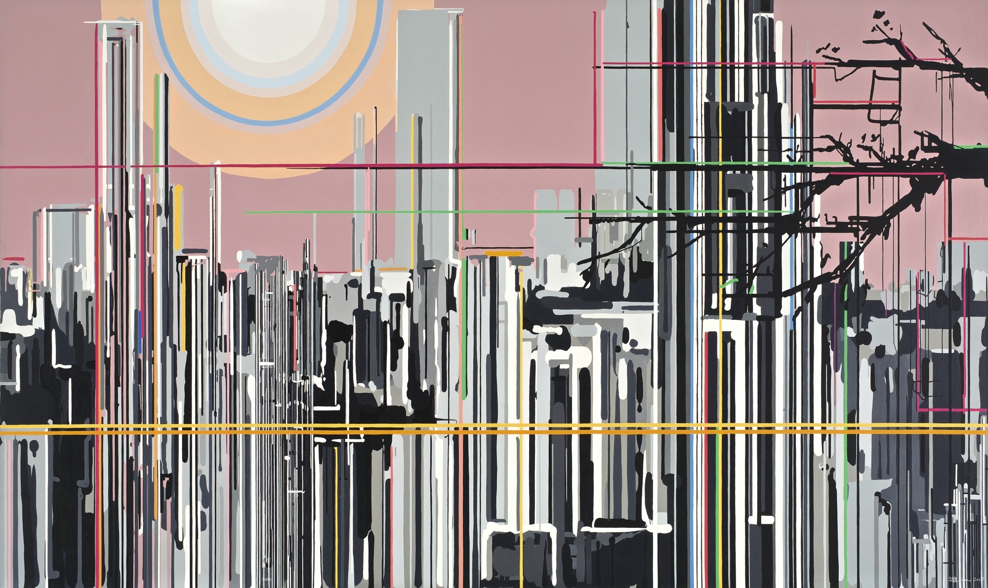 - 고층 건물과 도심 풍경을 디지털 선과 추상적 색면으로 재현한 유화 작품이다. 불안하게 굵어지는 색선들은 도시의 과밀함과 감각 과부하, 그리고 현실의 왜곡을 은유한다. “추상은 나에게 현실을 창조해낸다. 컴퓨터 화면 속 무엇은 이미 존재한다”고 말하는 그는, 디지털 미디어와 도시 환경이 우리의 지각을 재구성한다고 봤다